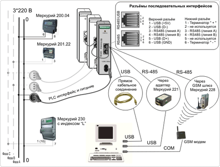В трёхфазной сети используется блок из трёх концентраторов соответствующей модификации связанных по интерфейсу RS-485.