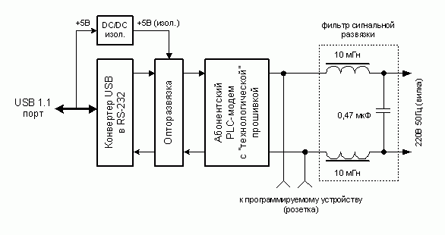 Технологический модем "Меркурий 223" (далее ТМ) используется для программирования сетевых адресов абонентских устройств (счётчиков электрической энергии со встроенными PLС-модемами серий "Меркурий"), предназначенных для применения в составе системы автоматизированного сбора данных по силовой сети "Меркурий-PLC". Для связи с внешним миром ТМ имеет два интерфейса: технологический PLC-интерфейс, который используется собственно в процессе программирования счётчиков (выведен на розетку верхней крышки корпуса) компьютерный USB 1.1 Блок-схема ТМ приведена ниже.