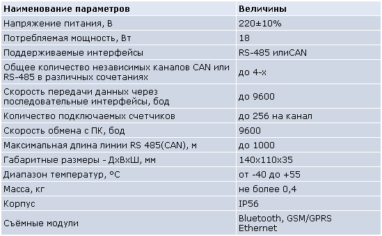 * беcпроводной доступ к счетчикам, подключенным к 4 каналам RS-485 (CAN) или PLC, через Bluetooth (GSM, Ethernet);